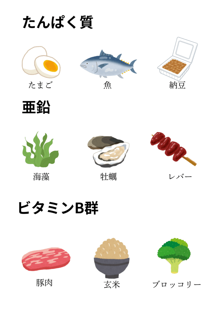 髪の材料となる「タンパク質(肉・魚・卵・豆類)」や、成長を助ける「ビタミンB群(豚肉・納豆・レバーなど)」を意識して摂取しましょう。