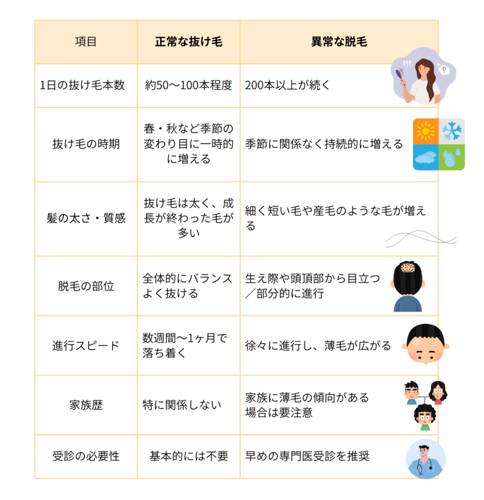 通常、1日50〜100本程度の抜け毛は自然現象ですが、長期間続く場合や薄毛の進行を感じる場合は専門的な診察が必要です。特に「1日の抜け毛が200本以上続く」「生え際や頭頂部が徐々に薄くなっている」「家族に薄毛の傾向がある」といった項目に複数当てはまる場合は、早めの受診をおすすめします。