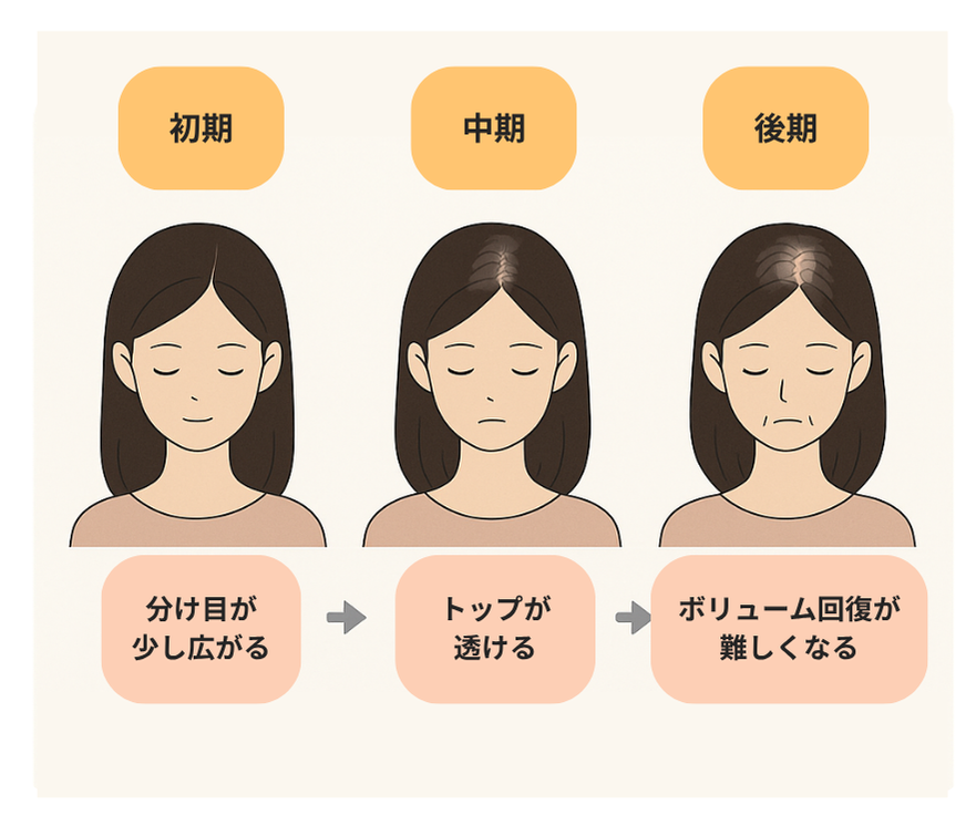 また、初期段階では「抜け毛が増えた」というよりも、髪のボリュームダウンや分け目の広がりから気づかれることが多く、「年齢のせい」と見過ごされやすい点も注意が必要です。