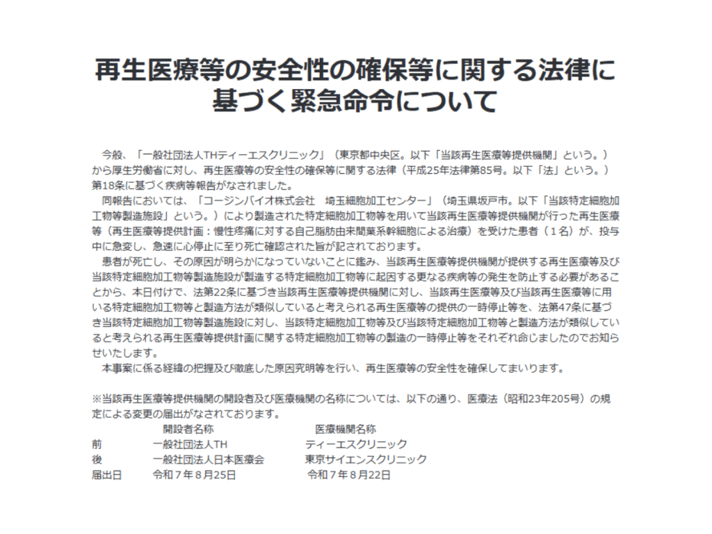 「再生医療等の安全性の確保等に関する法律に基づく緊急命令」に関する事案につきまして、当院は一切関与しておりません。